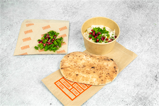 Zuurdesempita met plantaardig shawarma, hummus, komkommer pickle tomaatmix, rode kool, tahini, zhug, spinazie, peterselie en granaatappel.